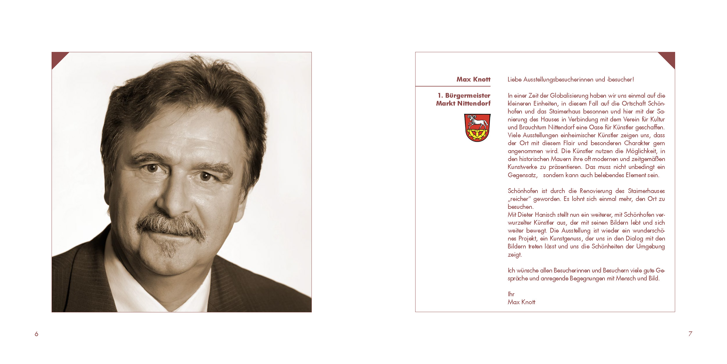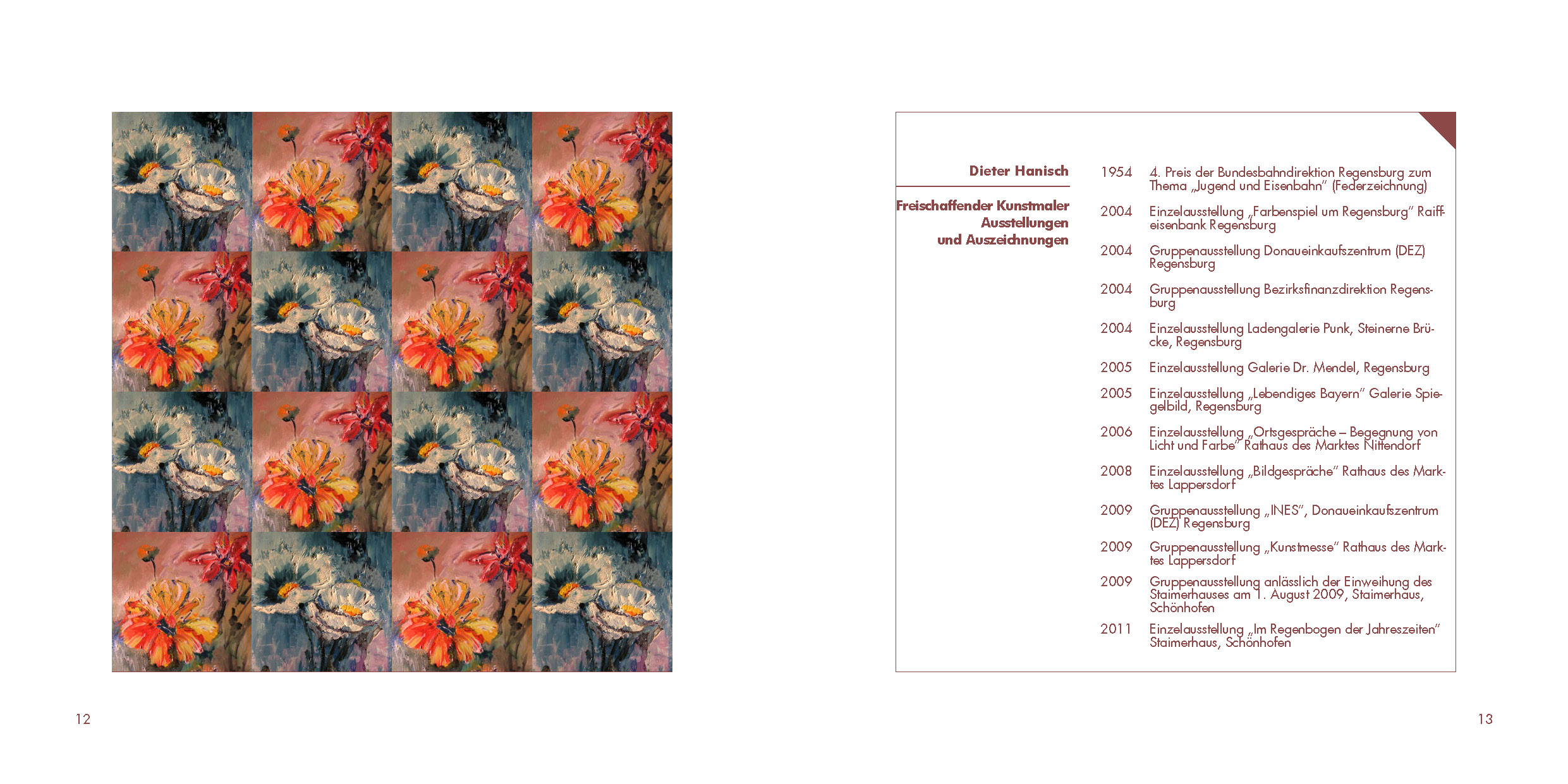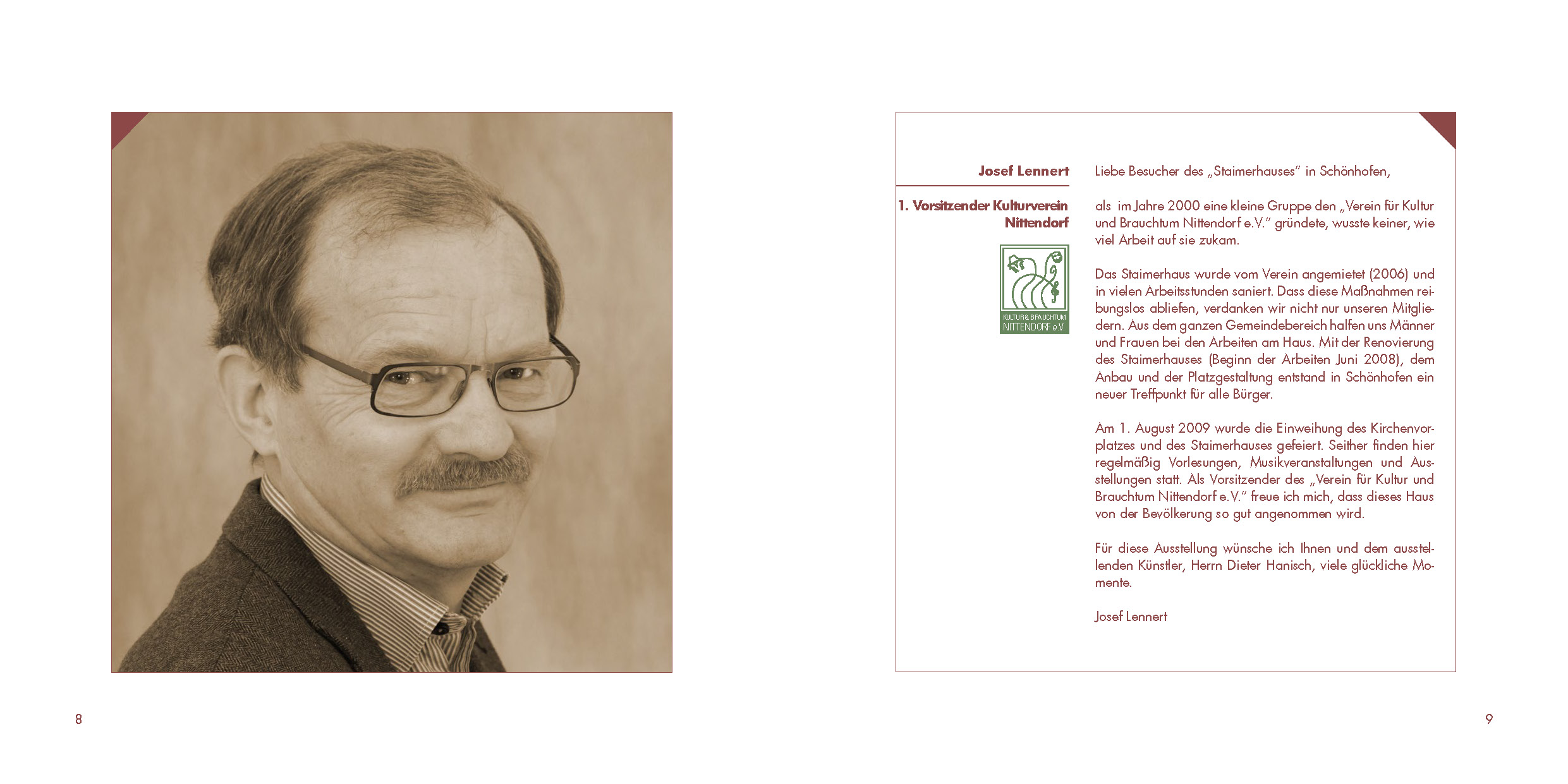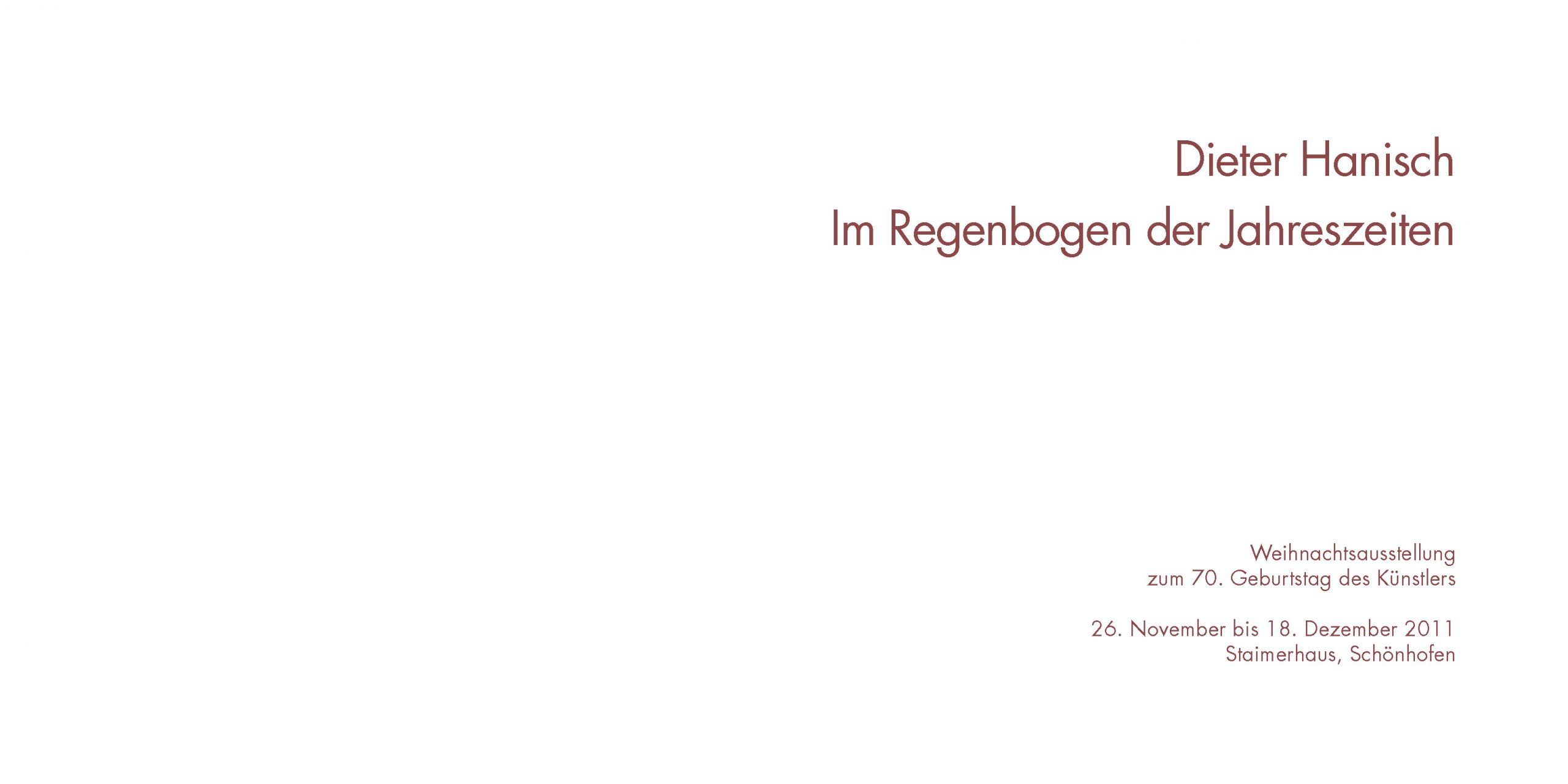 Ausstellungskataolg Hanisch zur Ausstellung „Im Regenbogen der Jahreszeiten“ im Steimerhaus Schönhofen Nittendorf. Am 1. August 2009 wurde die Einweihung des Kirchenvorplatzes und des Staimerhauses gefeiert.Seither finden hier regelmäßig Vorlesungen, Musikveranstaltungen und Ausstellungen statt.